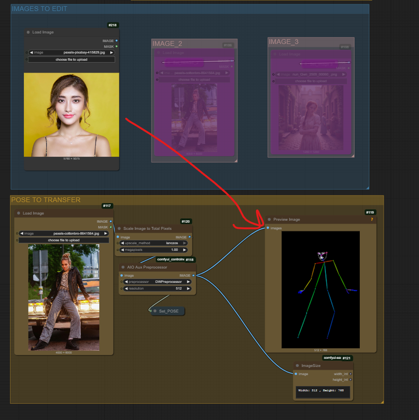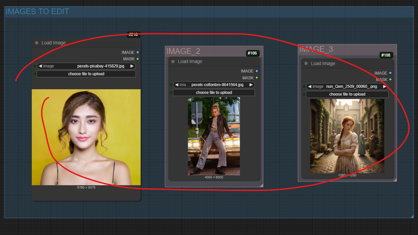 Qwen Image Edit 2509 supports multi-image editing — a defining feature. The workflow lets you load up to three images: