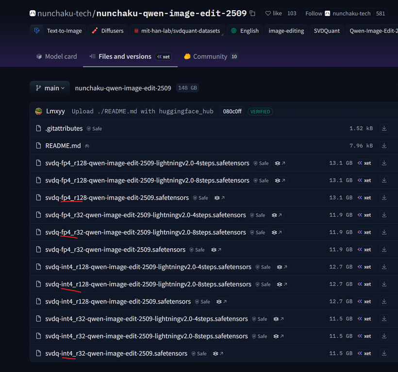If you have less than 12 GB of VRAM, aim for the INT4 R32 models (lighter and faster); if you’re above that, use the R128 for richer, more detailed image quality.