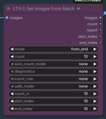 IAMCCS_LTX2_GetImageFromBatch is used to grab the exact portion of frames you want (most often: “from_end” to take the tail frames that will guide the next segment). In the workflow file you can see it configured in a classic extension-friendly mode (e.g., from_end with a count).