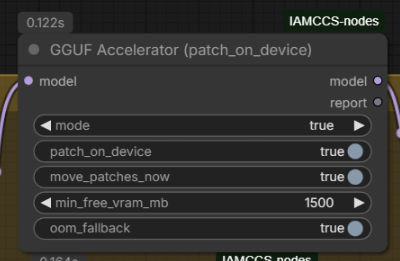 If you’re using a GGUF UNet route, the workflow includes IAMCCS_GGUF_accelerator, which is meant to reduce the painful CPU↔GPU patch movement overhead (especially when LoRA patches are involved). It doesn’t magically change your sampling quality—this is runtime/throughput hygiene.