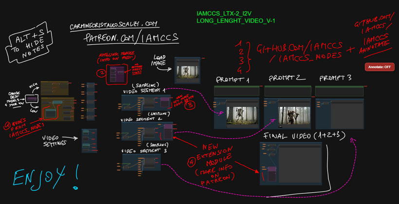 Today I’m sharing a Long Length Video workflow for LTX-2 in ComfyUI, built around the latest updated IAMCCS_nodes The whole point is simple: you generate a solid first segment, then you extend it iteratively (multi-segment) while keeping continuity, overlap, and timing under control—without turning your graph into spaghetti.